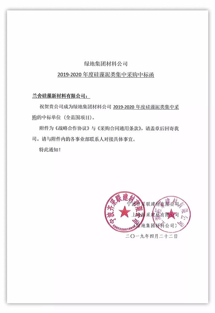春光大好,兰舍再收“喜报”。4月22日,兰舍硅藻泥正式成为绿地集团2019-2020年度全国范围项目硅藻泥/硅藻砖类集中采购中标单位。自此,兰舍将以无可比拟的质量和工艺开启与绿地集团的精诚合作。